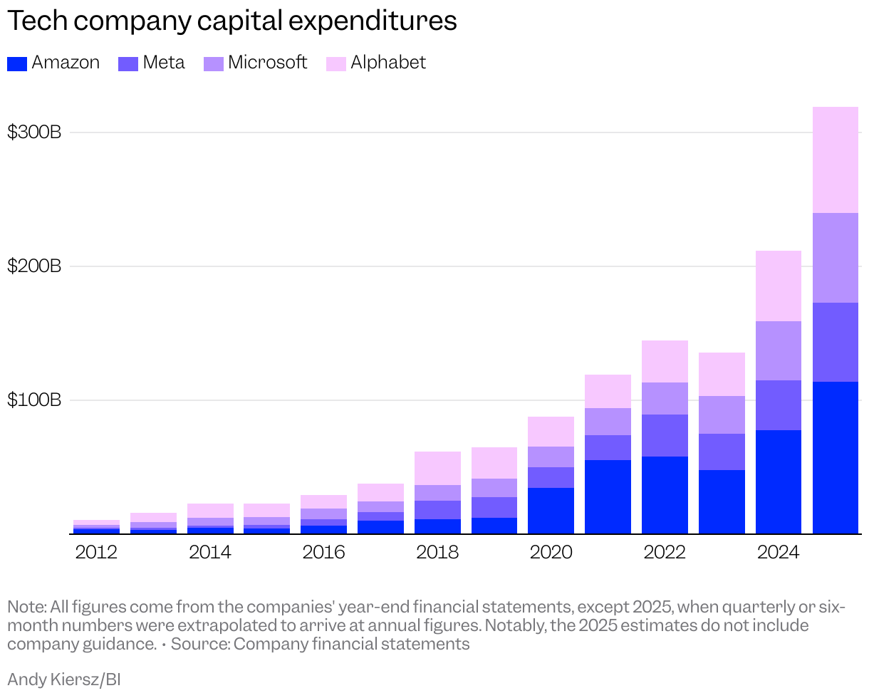 Leading technology companies, including Amazon, Meta, Microsoft, and Google, are driving this expansion. Their combined capital expenditure on AI infrastructure is estimated at $320 billion, exceeding the GDP of Finland and approaching ExxonMobil's total revenue in 2024.