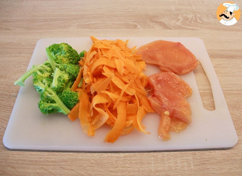 First things first, prepare your chicken and vegetables. * Slice the chicken fillet horizontally to create thinner pieces. This helps it cook more evenly and quickly. * Give your vegetables a good wash. * Peel the carrots and then slice them thinly. Aim for consistent thickness so they cook at the same rate as the other ingredients. * Break the broccoli into bite-sized florets.