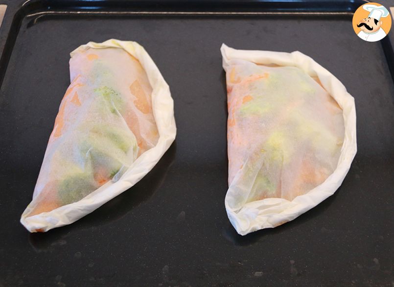 This is where the steaming magic happens. * Carefully fold the parchment paper over the ingredients, keeping the chicken and vegetables in the centre. * Begin folding the edges of the parchment paper inwards, creating a series of neat triangles all around the parcel. * Continue folding until you have a tightly sealed package. The key here is to make it as airtight as possible to trap all the steam. You don’t want any delicious juices escaping!