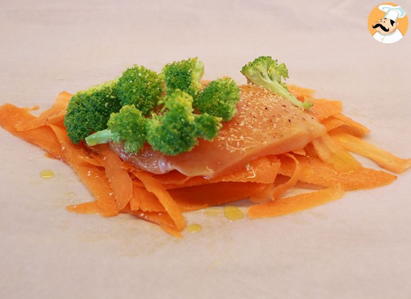 Now for the magic of the parchment paper. * Tear off a large square of parchment paper. You want enough to comfortably enclose all your ingredients and seal them tightly. * Imagine dividing the paper into thirds. On the bottom third, place half of your thinly sliced carrots. * Lightly season the carrots with a pinch of salt and pepper, and then drizzle with a little olive oil. * Next, add half of your prepared chicken fillet on top of the carrots. * Season the chicken generously with salt and pepper, and give it another drizzle of olive oil. * Finally, top the chicken with half of your broccoli florets. Drizzle with a bit more olive oil and season with salt and pepper.