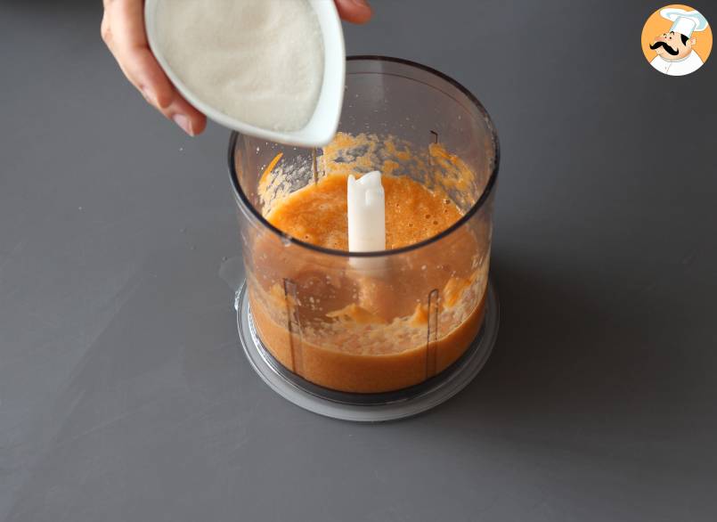 To the apricot purée, add the egg white, sugar, and lemon juice. Now, it's time for a more vigorous blend. Continue to mix everything together for approximately 8 minutes. This extended blending time is essential. It's what aerates the mixture, incorporating air and creating the light, fluffy consistency characteristic of a true mousse. You'll notice the mixture gradually becoming lighter in colour and increasing in volume.