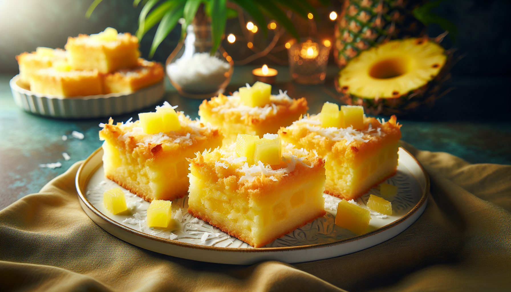 Pineapple and Coconut Squares These delightful squares are a tropical dream. A simple yet utterly delicious recipe, they bring together the classic pairing of pineapple and coconut for a perfect dessert treat that’s sure to disappear fast.