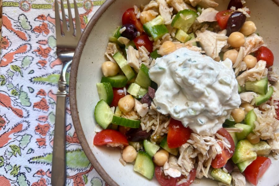 This speedy, high-protein Greek bowl demonstrates that a satisfying meal doesn't require extensive preparation. Succulent chicken, hearty chickpeas, and a creamy yogurt sauce combine over warm rice to create a Mediterranean-inspired dish that's both fresh and filling, ready in just minutes. Crisp cucumbers and a touch of yogurt add brightness and flavor to every bite, making it ideal for busy weeknights, make-ahead lunches, or any time you desire a nourishing meal without the wait.