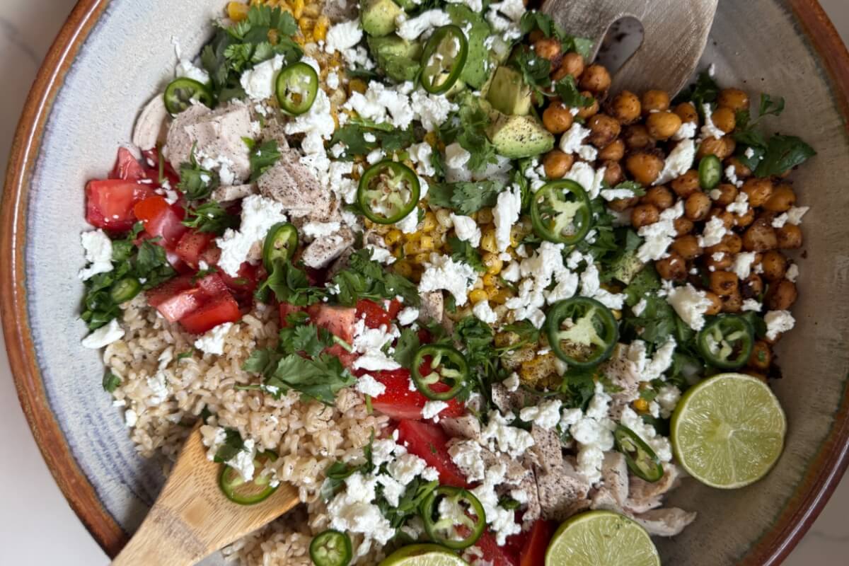 Take advantage of the abundance of fresh produce available at late-summer farmers' markets with this vibrant bowl featuring tomatoes, corn, and peppers. This 15-minute protein bowl offers plenty of protein from chicken and chickpeas, color and texture from fresh vegetables, and a zesty squeeze of lime that will have you craving it.