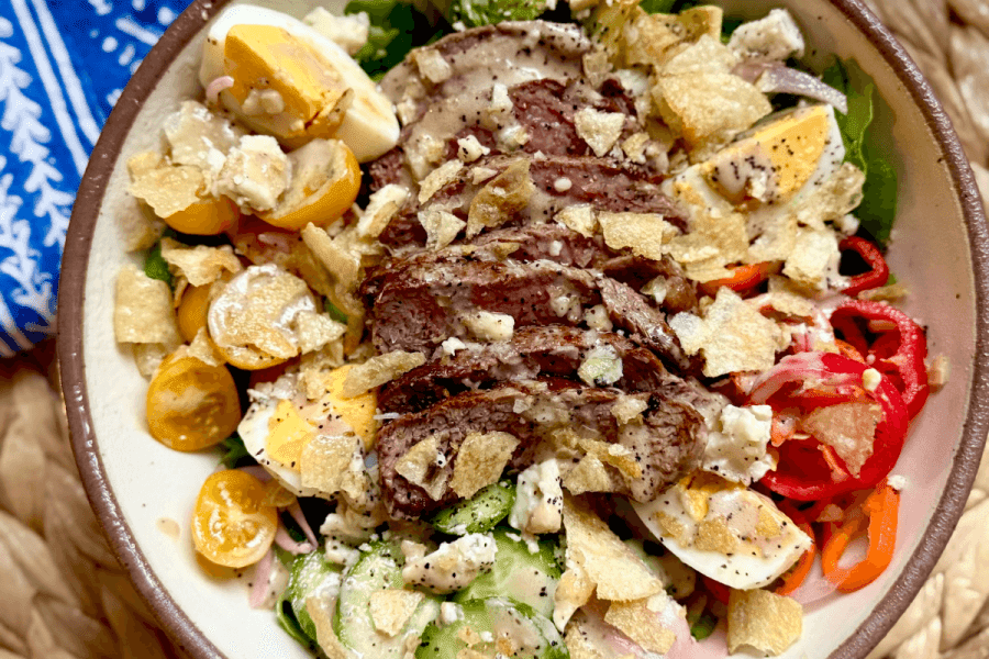 Featuring fresh greens, juicy steak, and a creamy balsamic dressing, this salad is a weeknight winner. The optional toppings, such as pickled onions and kettle chips, add personality and make the whole dish come together faster than you might expect. Protein-packed and deeply satisfying, it proves that a salad can indeed be a complete and satisfying meal.