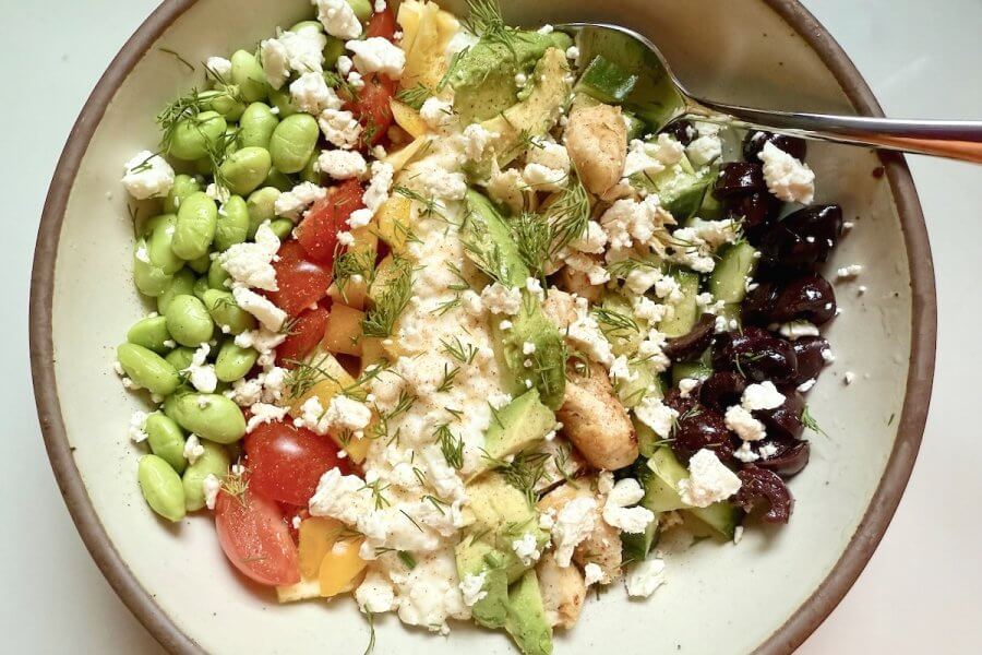Ready in just five minutes (with prepped ingredients), this protein powerhouse delivers over 50g of protein under 500 calories. The secret? A clever combination of cottage cheese, chicken, and Mediterranean favorites like feta, edamame, and fresh vegetables. Perfect for meal prep, you can stock these ingredients weekly for the easiest healthy lunch ever.