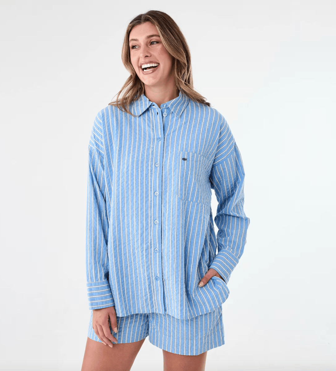 Kmart Long Sleeve Oversized Seersucker Shirt, $25, and Seersucker Shorts, $15.