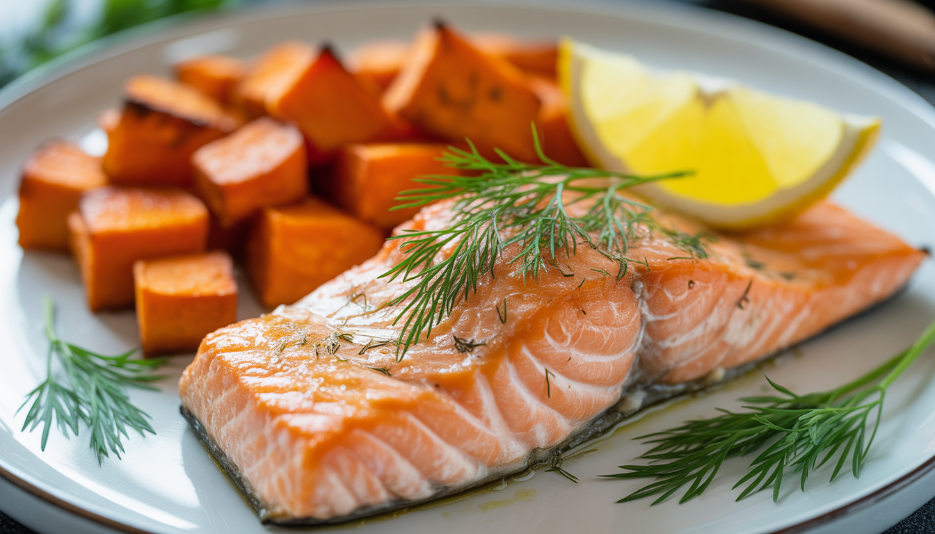 Salmon is an excellent source of omega-3s, essential for heart health. Accompanied by roasted sweet potatoes, you get a balanced and colorful meal. Children love the sweetness of the potatoes, and adults appreciate the simplicity of the preparation. A squeeze of lemon, a sprinkle of dill and you're done!