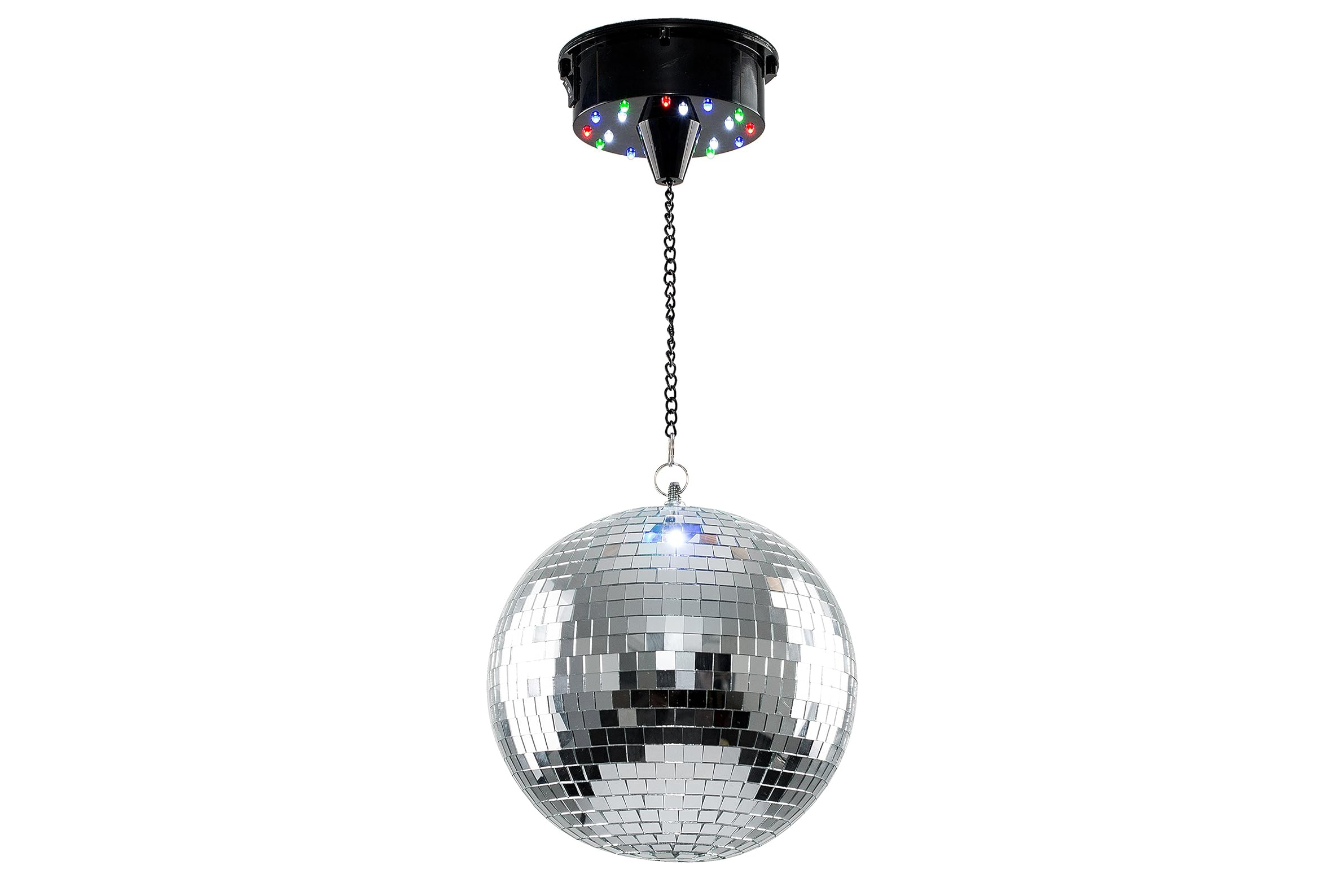 Get the party started instantly with this fully equipped, battery-operated motorised disco mirror ball. It rotates automatically, spreading sparkles across every corner of the room, and features integrated coloured lights for an enhanced disco ambiance. Installation is straightforward, requiring only a ceiling hook.