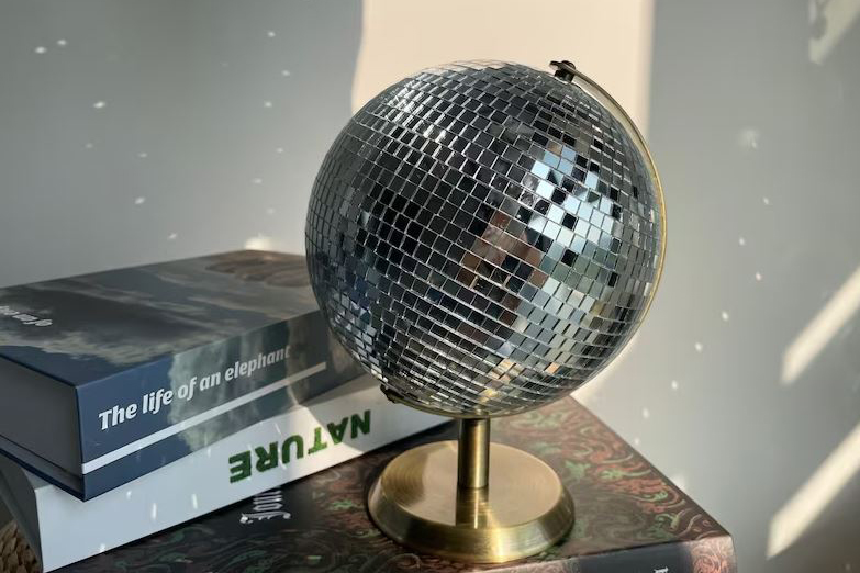 Embodying the universal language of disco, this tabletop version of a disco ball sits on an axis, resembling a globe. It's designed to spin with a gentle tap, sending light pinging joyfully around the space. Available in two sizes, it's a perfect way to showcase your love for the genre without altering walls or ceilings.