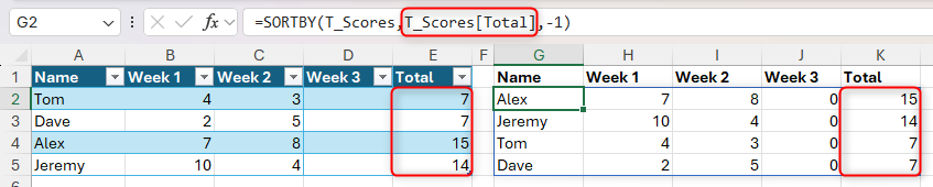 =SORTBY(T_Scores,T_Scores[Total],-1)extracts and sorts the whole T_Scores table by the Total column (T_Scores[Total]) in descending order (-1).