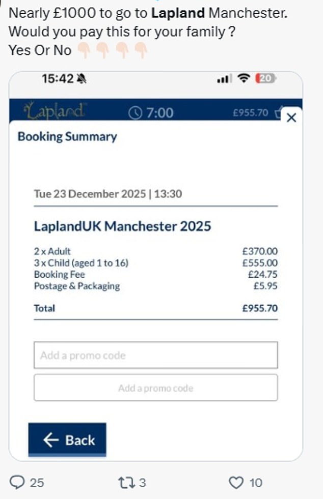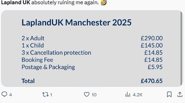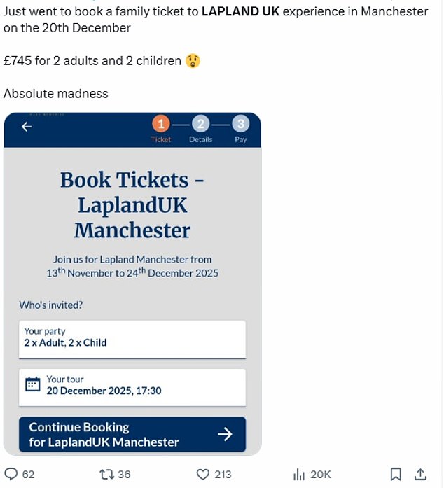 One X user wrote: 'Just went to book a family ticket to the Lapland UK experience in Manchester on the 20th December. £745 for two adults and two children. Absolute madness.'