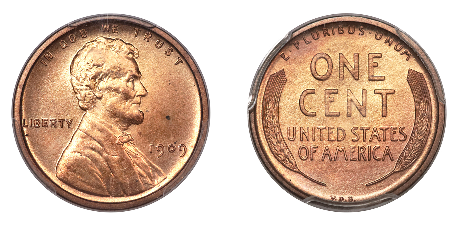 In 1909, the US Mint created a Matte Proof penny, never intended for circulation. The initials of the coin designer, VDB, are stamped on the back. PCGS reports that only about 200 examples are known to exist, though more were minted and likely destroyed. The existing coins were mostly stored, so they are in pristine condition.