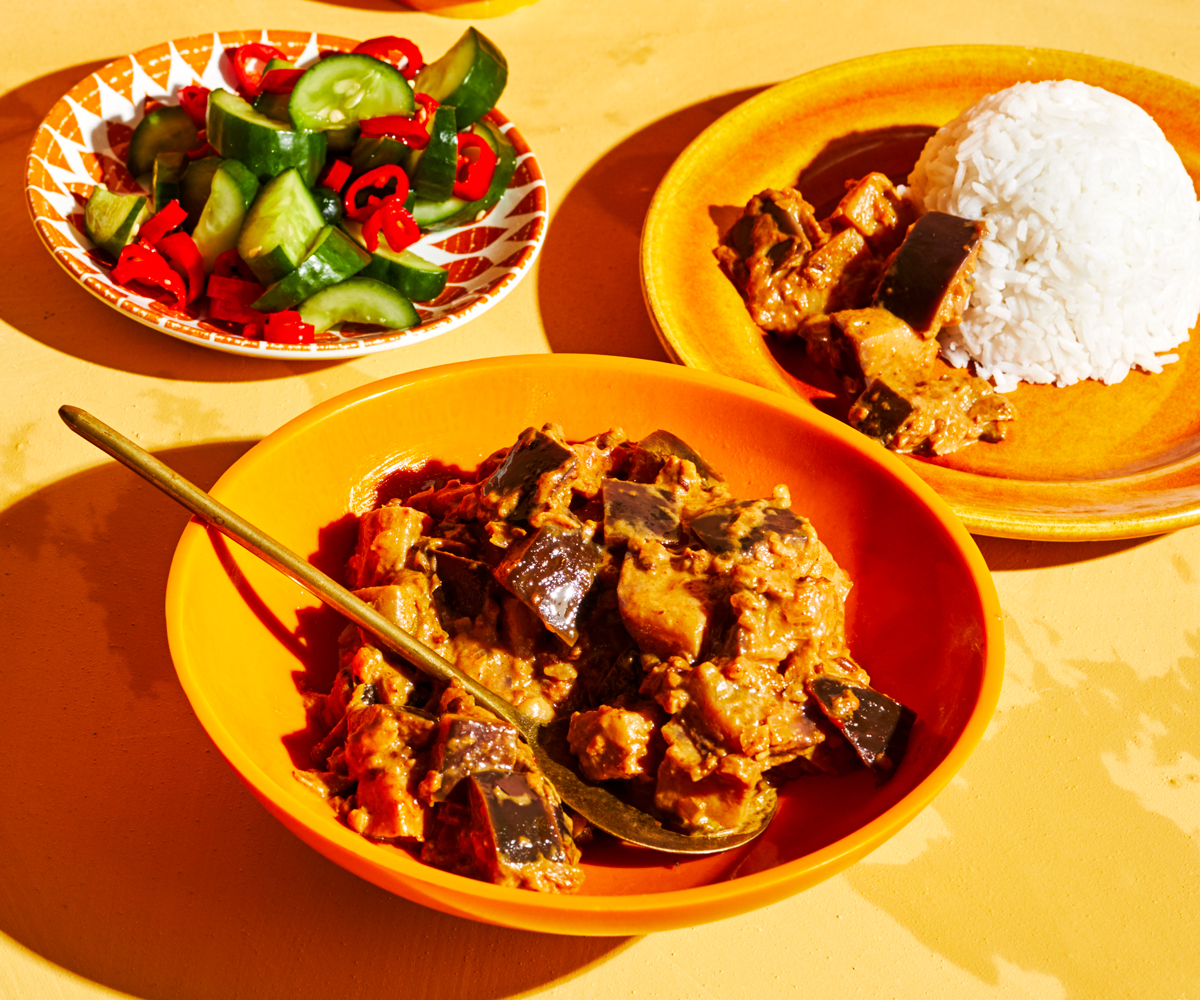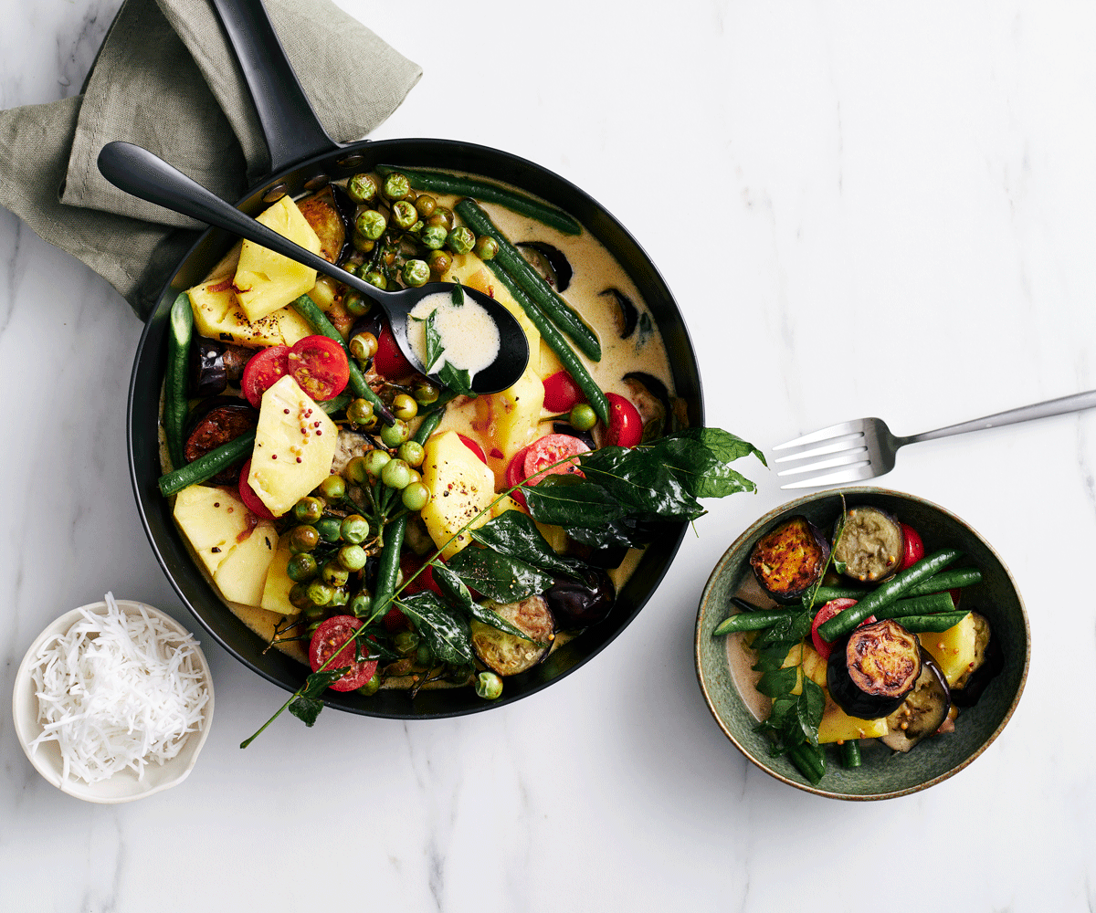 This curry is a perfect all-weather dish. It’s warming enough for winter but light enough to enjoy during the summer months, with the sweetness of pineapple balancing the earthy eggplant. -