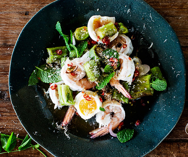 Fire up the barbecue for this flavour-packed Thai grilled eggplant salad. The smoky notes of the eggplant are beautifully enhanced by succulent prawns and a vibrant dressing. -