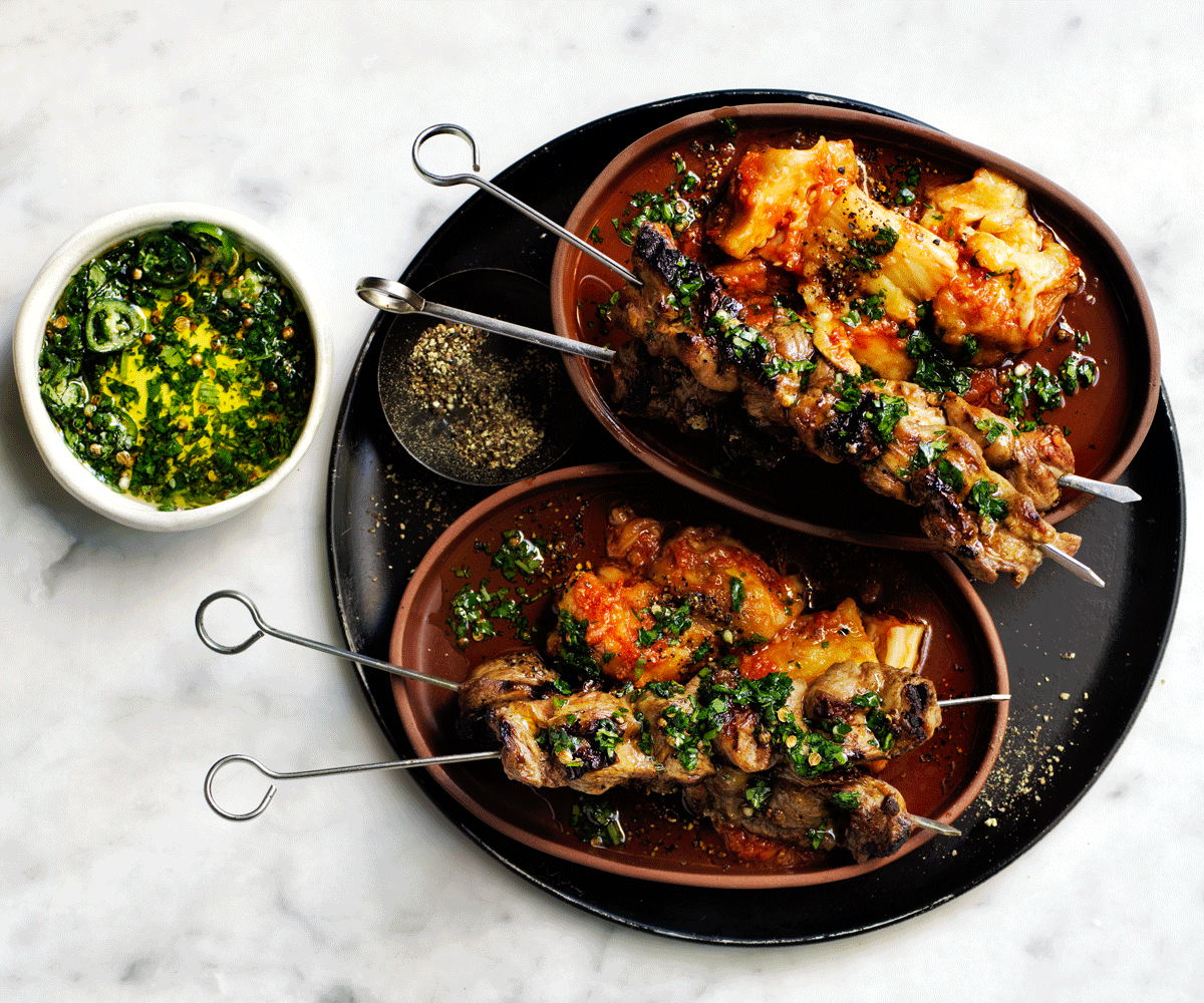 Warm Eggplant Zaalouk with Spiced Lamb Skewers