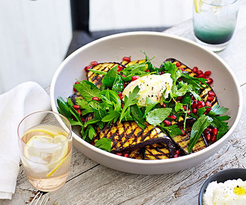The ultimate eye-catching vegetable dish for your next barbecue. The smoky flavour of barbecued eggplant is beautifully enhanced by creamy goat's curd, fresh mint, and tart pomegranate seeds. -