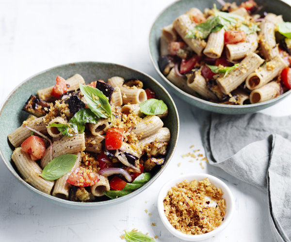 A vegan pasta dish that’s both satisfying and flavourful. A generous sprinkle of pangrattato and fresh basil leaves add texture and aromatic depth to the roasted eggplant and tomato combination. -
