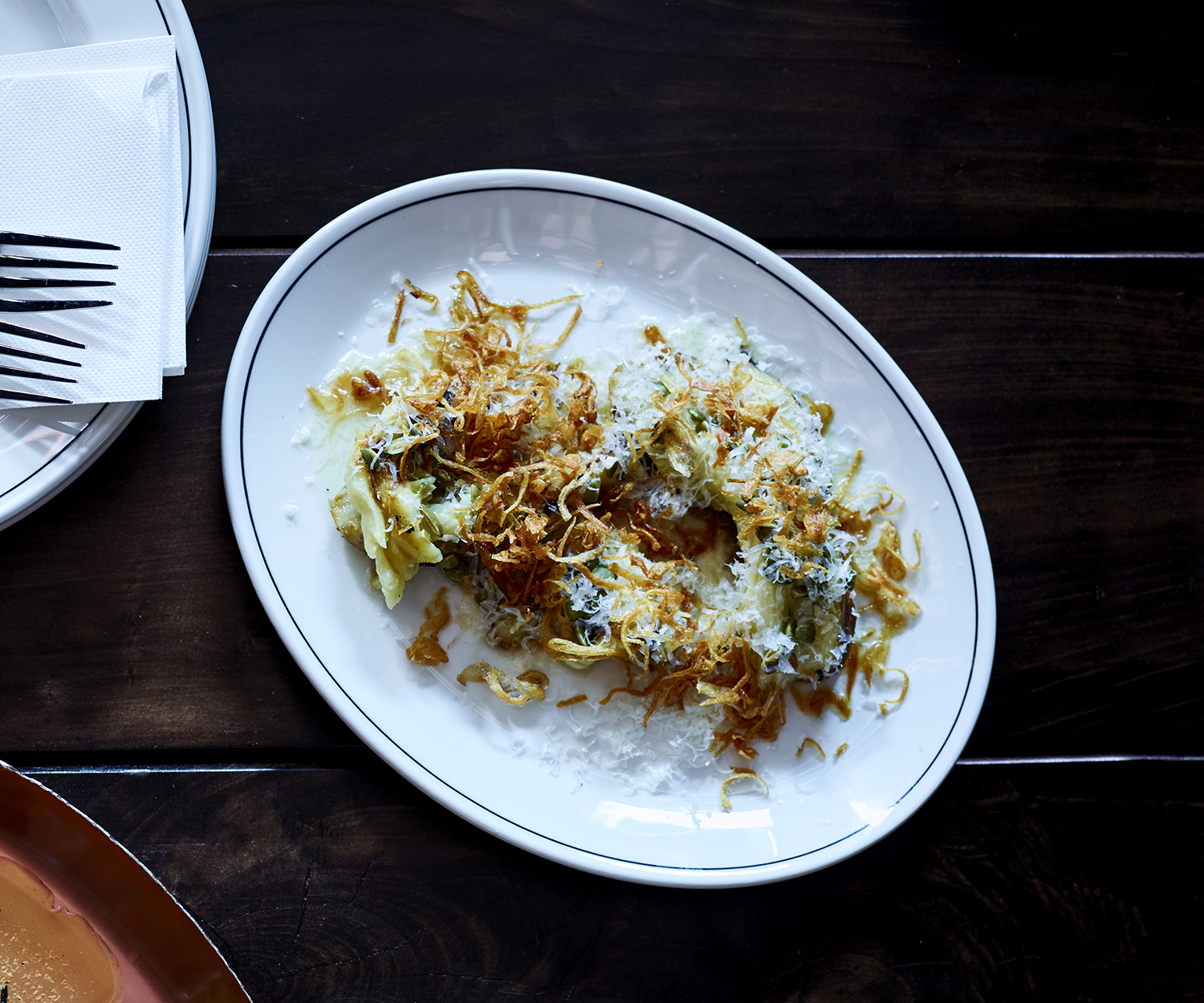 A simple yet inspired creation from renowned chefs, this dish features butter-fried bread topped with tender eggplant and fresh herbs, highlighting the beauty of humble ingredients. -