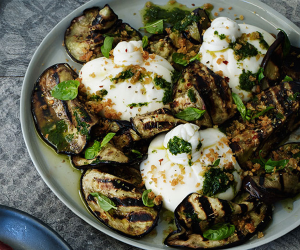 The creamy indulgence of burrata is perfectly paired with the smoky, tender char of grilled eggplant in this simple yet stunning dish. -