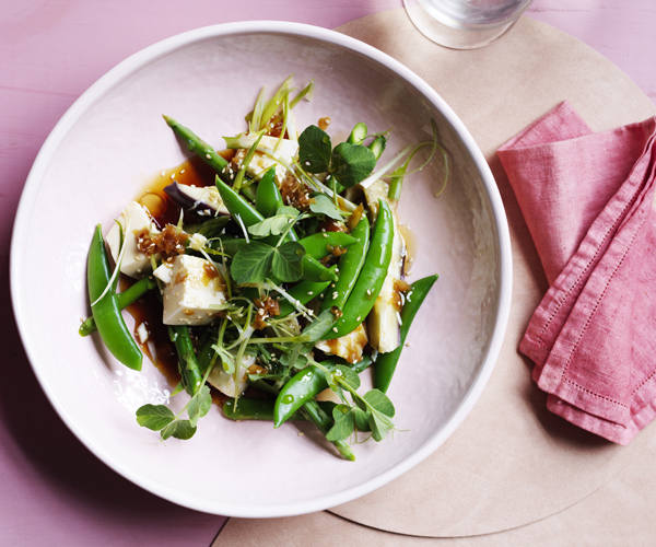 A light and refreshing salad that sings with Asian-inspired flavours. The combination of eggplant, tofu, and crisp sugarsnap peas is brought together by a zesty ginger and soy dressing. -