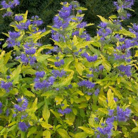 Bluebeard, also called blue mist shrub, is a pollinator favorite, producing an abundance of blue blooms in late summer when many other plants are taking a break from the heat. The cultivars Lil Miss Sunshine®, 'Sunshine Blue II' and La Barbe Bleue™ feature vibrant yellow foliage that complements the blooms. A woody shrub in warmer areas of its range, bluebeard dies back to the ground in zones 7 and colder. This does not impact flowering, as bluebeard blooms on new growth.