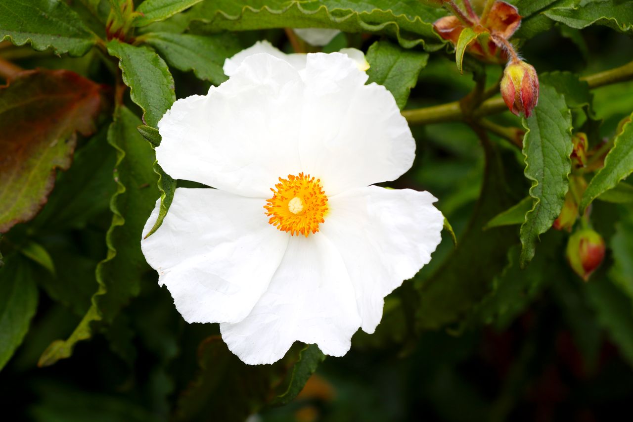 Though the foliage of 'Mickie' rock rose is variegated green and yellow, it is the golden hues that dominate, turning this broad-leaf evergreen into a glowing mound. Plant this tough shrub in dry, exposed areas of the garden, as it thrives in full sun and requires little to no irrigation once established. 'Mickie' rock rose is also a great selection for coastal gardens, as plants tolerate the warm, salty air.