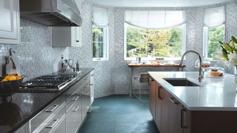 Other ways to bring the industrial feel into your design choices are through lighting, seating, and even the actual color of the space. Hanging pendant lights can help to change the look of your kitchen to give it a more industrial vibe, with pendants costing as little as $10 each. If you have space for stools, consider adding backless, metal-based stools like Kardashian did. Walmart Mainstays carries backless stools with a metal base for under $35 each. Paint can also change the look of a room. While Kardashian has off-white walls, another option is to bring more gray into your space — the other color that is prominent in her kitchen.