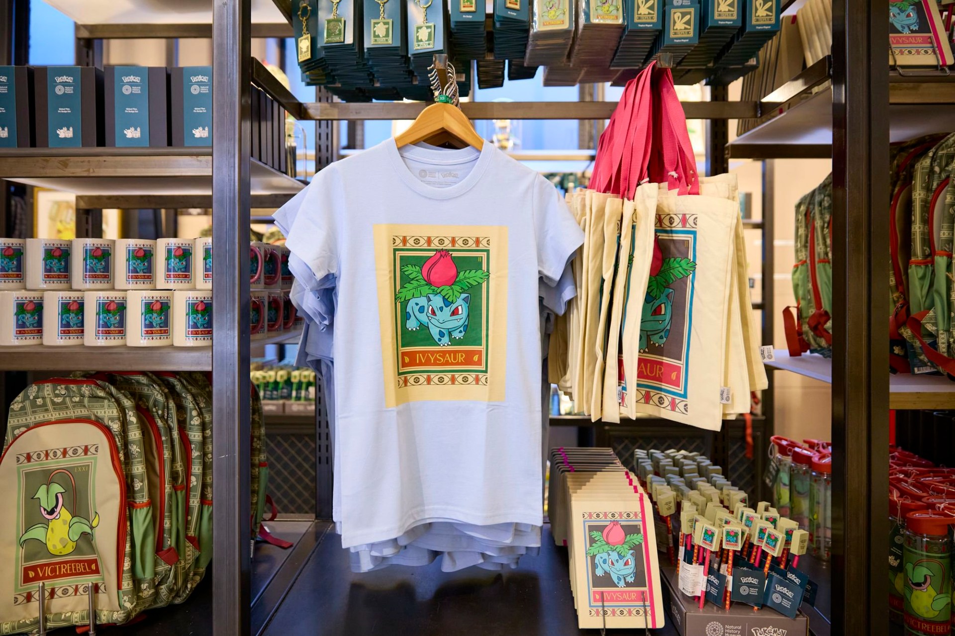 Rather than generic franchise visuals, the merch takes cues from the museum itself: Hintze Hall, botanical ceiling panels, and archival illustration styles reworked with grass type pokémon and specimen label aesthetics. It’s subtle enough to feel clever, but obvious enough that it still appeals to casual fans.