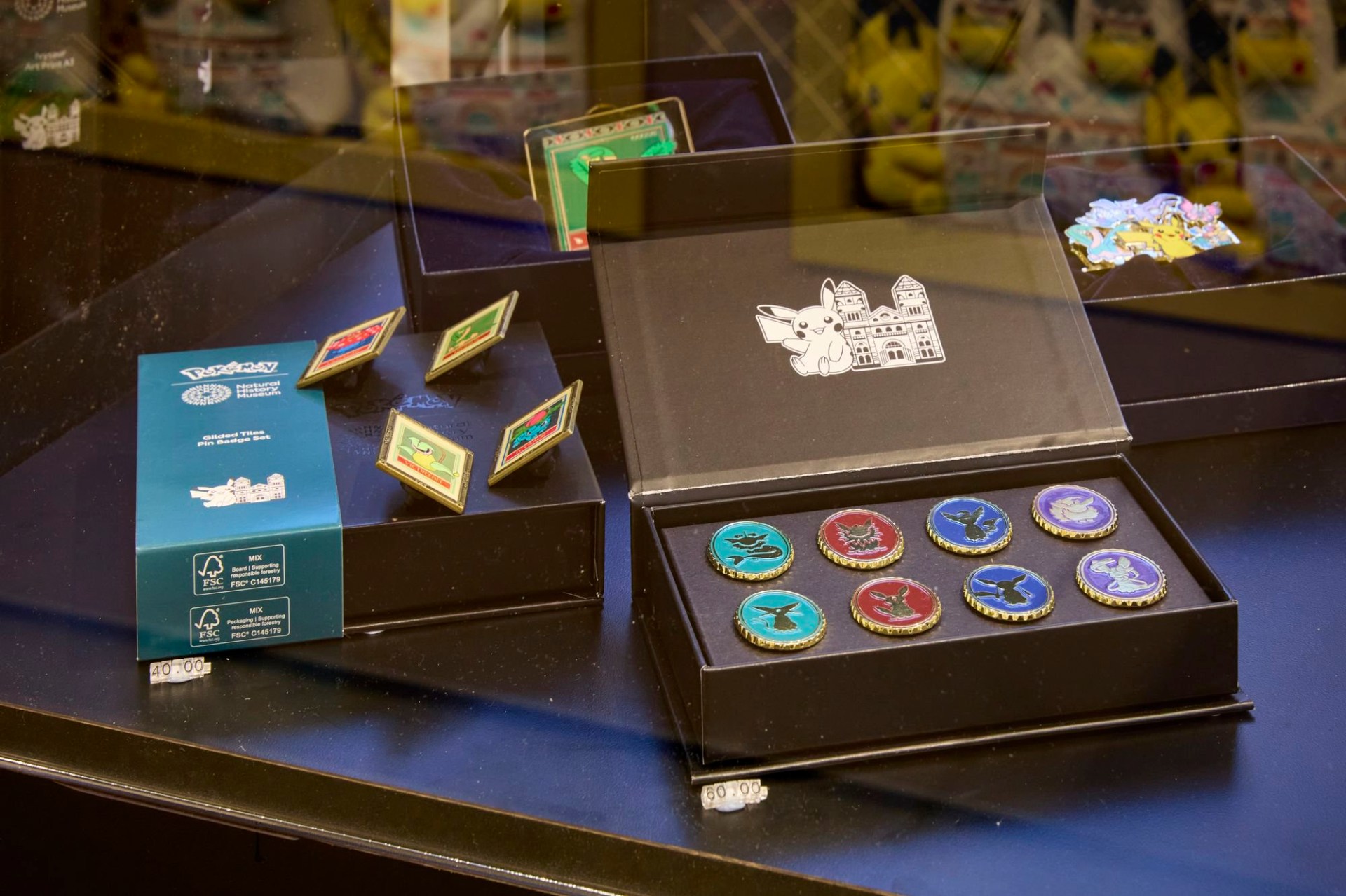After the plush, the most sought after items on my shopping list were the pin badges. The Eevee Evolution enamel pin set, including a full eight badges, are clean, collectible, and very much not for kids. Alongside them sits the Gilded Tiles pin set, which leans harder into architecture and patterns than characters, with a clear statement that, ‘I’m an adult and I like Pokemon, but I am also very sensible’.