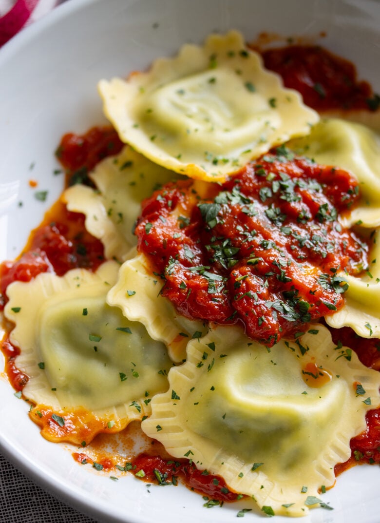 - On a warm plate, spread a spoonful of tomato sauce and arrange the ravioli over it. Add a couple of spoonfuls of tomato sauce over the ravioli and add more parsley.