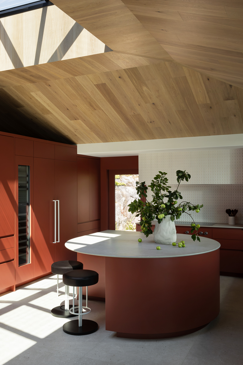 Furthermore, the irregular rooflines of the structure posed an obstacle to extending cabinetry all the way to the ceiling. "We decided to embrace these architectural nuances and clad them with oak panels," explains Ben Leavitt. "The outcome is a harmonious integration that complements the kitchen's colour scheme." Paying homage to the 1970s, a rich rust tone injects energy into the space without creating any visual discord.