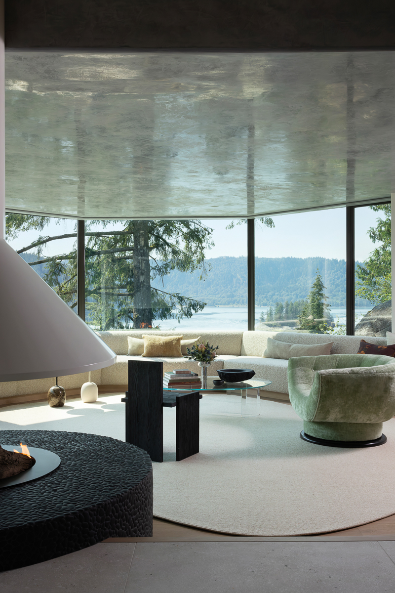 In the living room, a striking black brutalist-style chair stands in elegant contrast to a generous 28-foot-long sofa, both strategically positioned to frame the hexagonal glass wall. Similar to the bedroom, the furniture in this space is intentionally low-profile to ensure unobstructed views, a critical element of the overall design. The distinctive round fireplace, a hallmark of 1970s design, was an existing feature that simply required modernization. As the days shorten and the fire is lit, the ambiance within the living room transforms into an even more inviting and cozy haven.