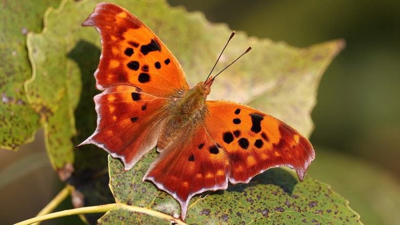 The eastern comma earns its name from the distinctive comma-shaped mark found on the underside of its hindwings. When its wings are closed, it is exceptionally well-camouflaged, appearing much like a dead leaf. Its ragged wing edges can span between 1½ and 2¼ inches. This non-migratory butterfly can be observed year-round in warmer climates. Like the mourning cloak, it overwinters as an adult, taking shelter under tree bark. Leaving trees undisturbed is the best way to support their winter survival. -