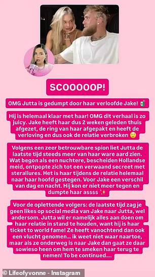 Dutch media personality Yvonne Coldeweijer was the first to report on the rumors, writing: 'Jutta has been dumped by her fiance Jake! He is completely done with her!