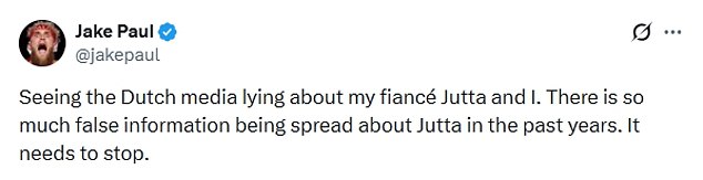 Taking to X, Paul said: 'Seeing the Dutch media lying about my fiancé Jutta and I. There is so much false information being spread about Jutta in the past years.