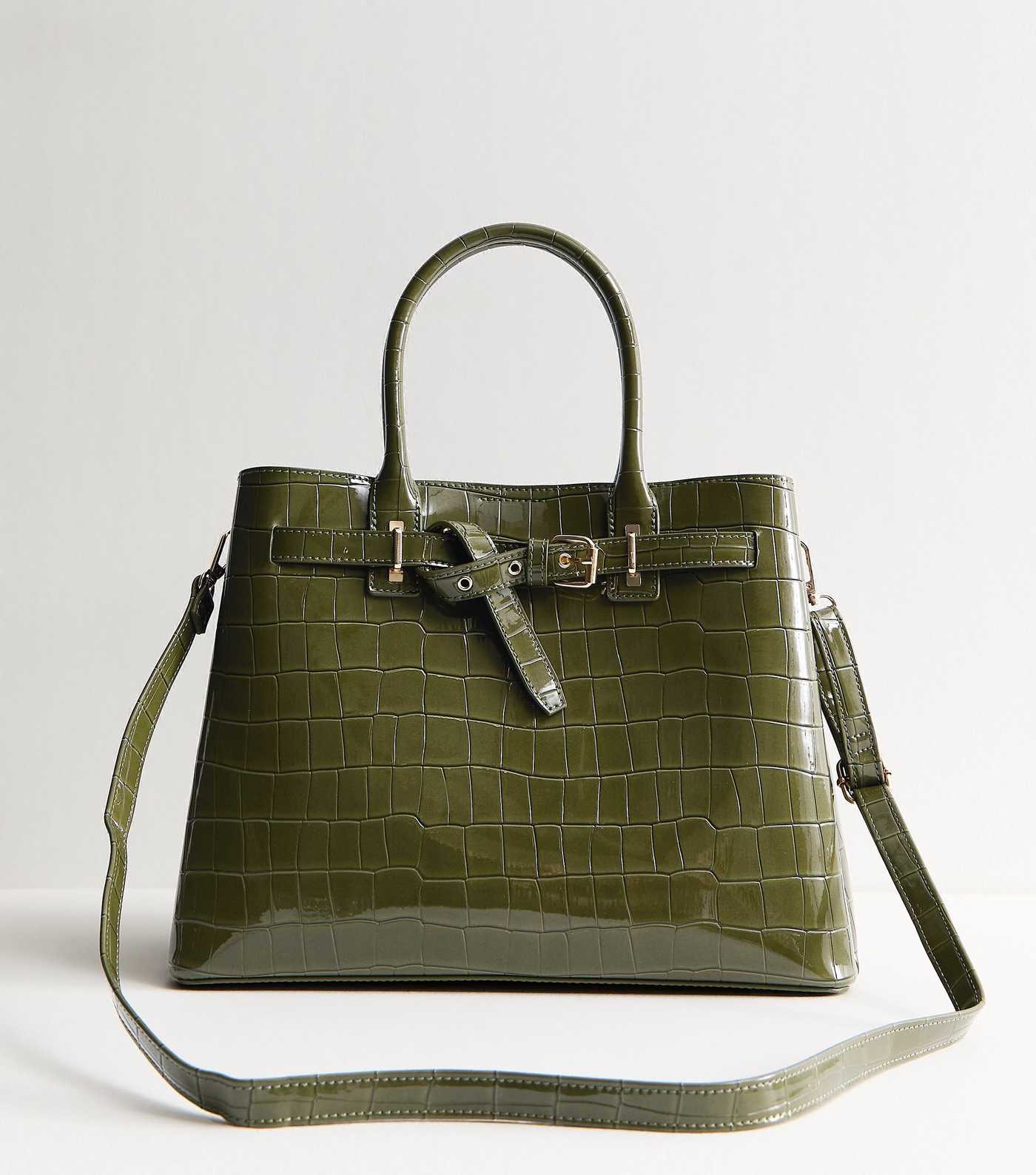 New Look Khaki Buckle Faux Croc Triple Compartment Tote Bag