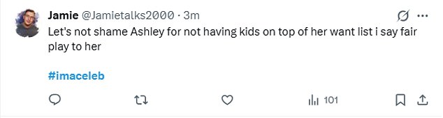 I'm A Celebrity viewers have praised Ashley Roberts for admitting having children 'isn't top of the list'.