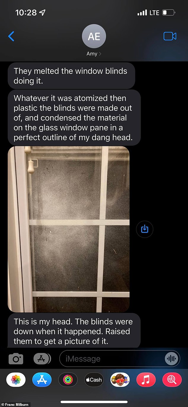 He claimed that images even appeared to show a scorch mark on Eskridge's home window, where the 'energy weapon' allegedly passed and struck her while she was working on her laptop.