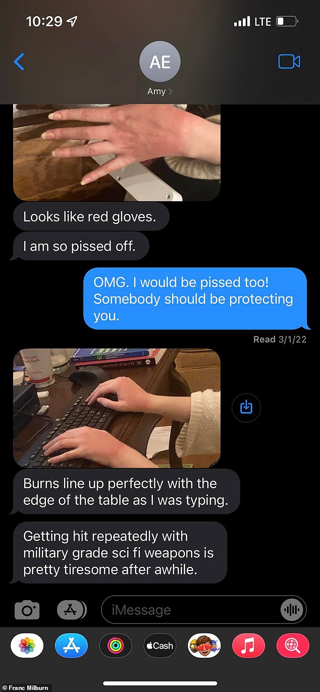 Among the allegations, Milburn claimed Eskridge reported injuries she believed were caused by what he described as a 'directed energy weapon,' a device said to emit focused energy capable of causing burns or other physical harm.