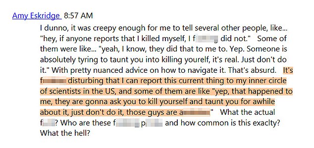 Milburn told the Daily Mail that Eskridge - as well as some of her colleagues involved in advanced propulsion and energy research - had been subjected to what he described as a sustained campaign of harassment and intimidation designed to derail their work.