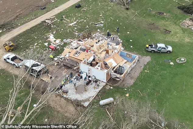 Multiple homes and structures in Buffalo County, Wisconsin - across the Mississippi River from Chester and Marion - were completely destroyed or severely destroyed by a tornado, according to photos shared by the local sheriff's office.
