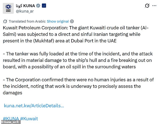 Kuwait Petroleum Corporation (KPC) said early on Tuesday that the Al Salmi was struck in an Iranian attack while anchored at Dubai port in the United Arab Emirates, causing damage to the vessel and a fire onboard.